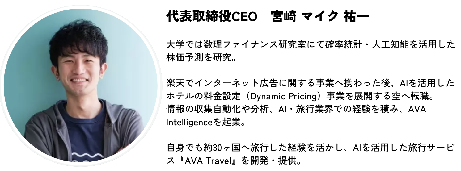 AVA Intellignece株式会社は、ユーザーの好み・条件などから簡単に旅行情報を探せるサイト『AVA Travel(アバトラベル)』を開発・運営しています。