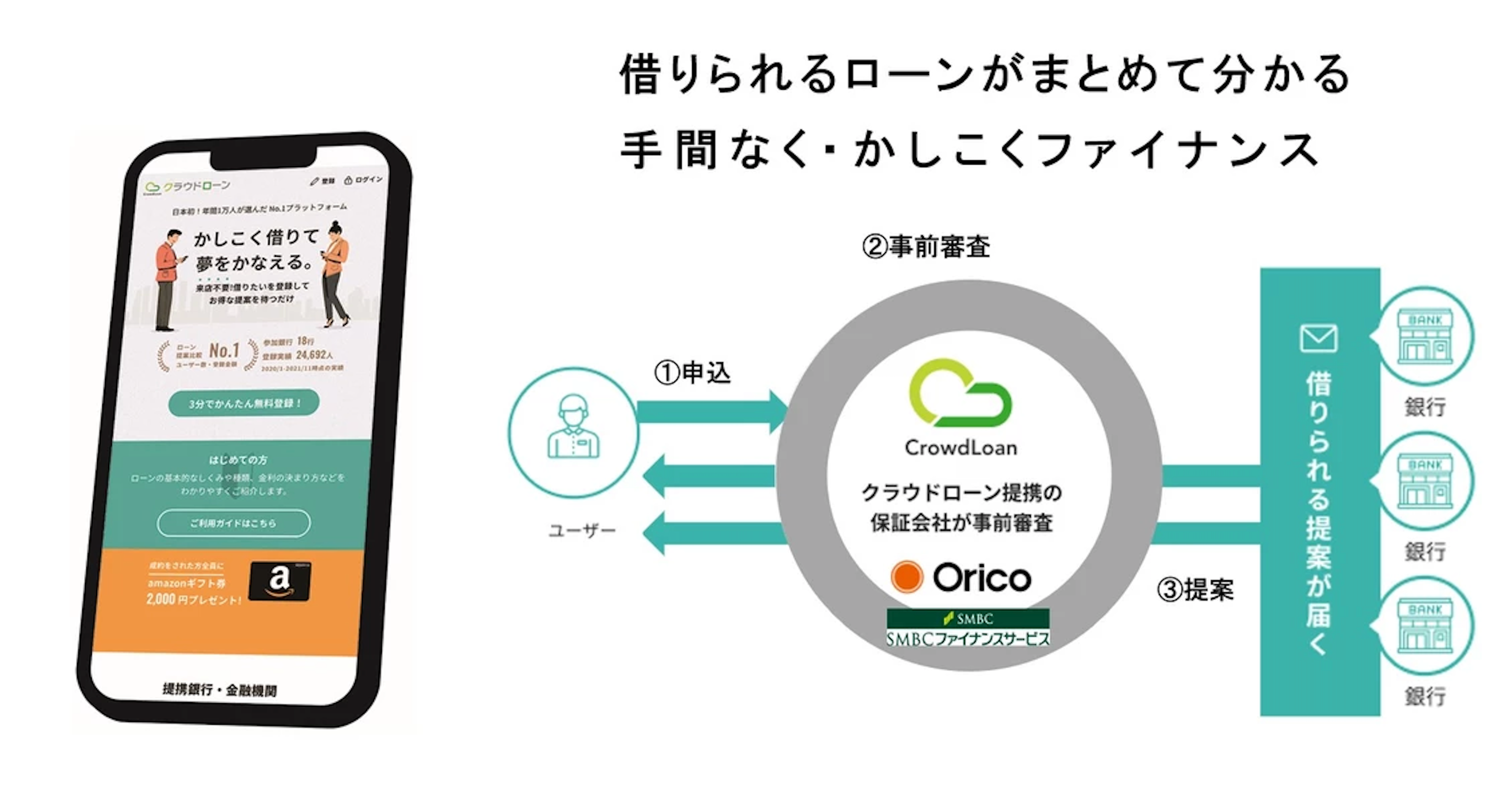 ユーザーが「借りたい」を登録しておけば、銀行から直接提案が届くレンディングプラットフォームです。1,000万円までの無担保ローンを中心に、数あるローン商品のなかからユーザーに最適なプランをマッチング。銀行をいくつもまわる手間はもう必要ありません。