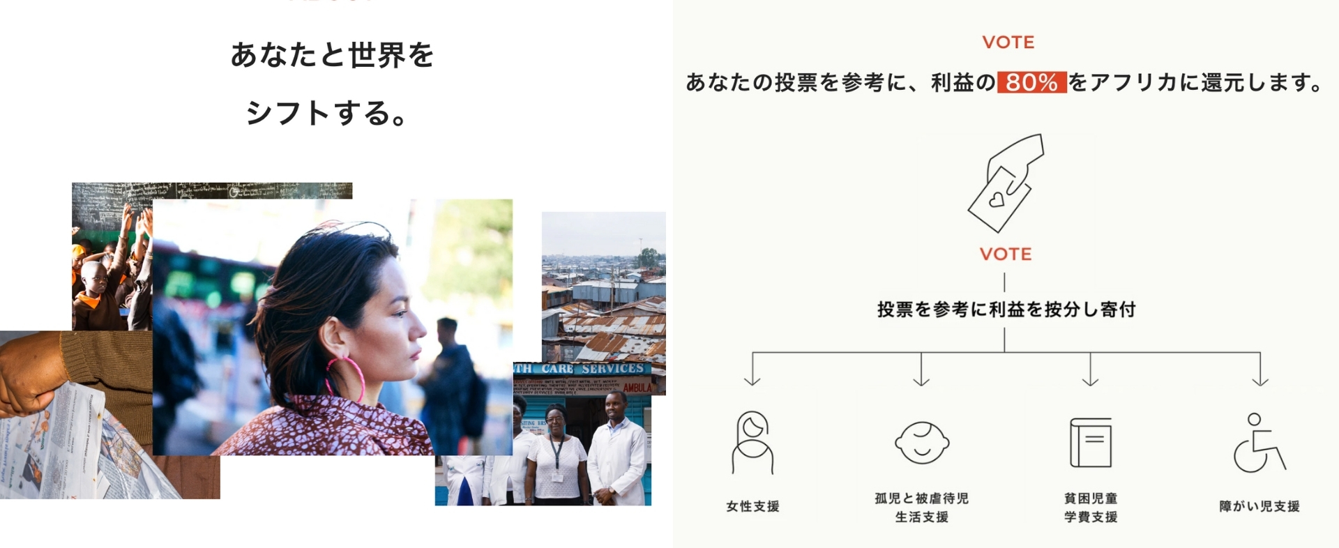 私たち株式会社こたつが運営するエシカルブランド「SHIFT 80」(シフトエイティ)は、余剰利益の80%をアフリカの現地コミュニティに還元し、孤児・貧困児童・困難な状況にある女性をサポートして、世界をシフトさせることを目的として活動しています。