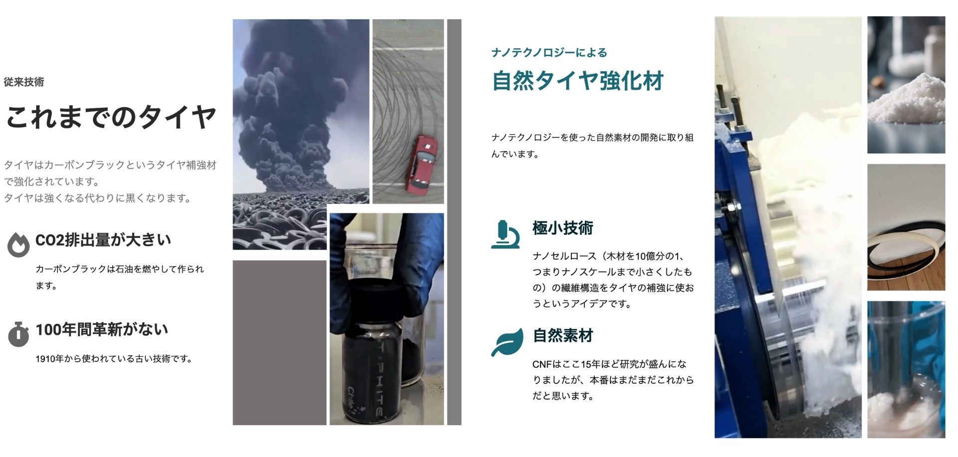 目下取り組んでいる課題は、最新の環境課題であるタイヤ粉じん問題で、国境を越えたいわゆるグローバルイシューです。世界中のタイヤを、黒い従来の石油由来のタイヤから自然由来の白いタイヤに変えていくという壮大なビジョンの実現に挑戦しています。