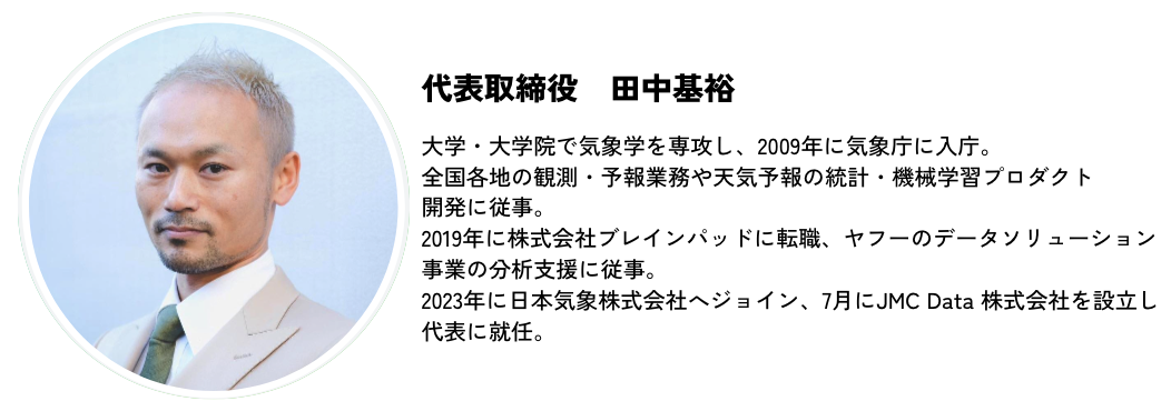 代表の田中は、気象庁で地方気象台、気象庁本庁で気象予報業務及び統計・機械学習プロダクト開発に従事後、国内最大手の受託分析会社でデータ分析業務、PMとしてチームリード経験を有しているハイブリット人材です。その他メンバーも気象のスペシャリスト、データ分析のスペシャリスト、営業のスペシャリストで構成されています。
