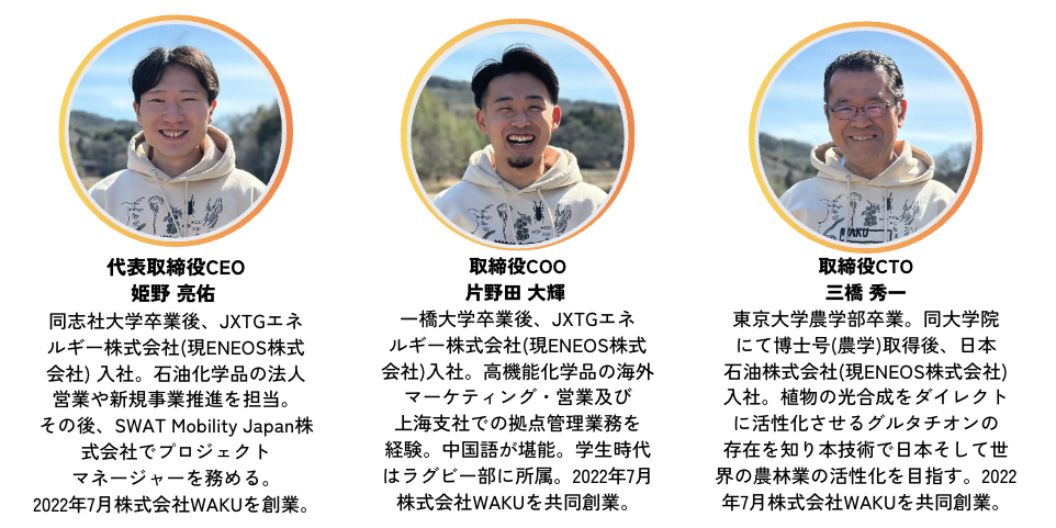 60年前、世界は人口の増加に伴う食糧危機問題に直面していました。しかし、「緑の革命」と称される科学技術革命によって人類は危機を脱しました。現在、我々はまさに60年前と同じ状況にいます。2030年には穀物生産量をタンパク質需要が上回るとされており、環境負荷を抑えながら耕地面積あたりの収量を増加させることが、社会から強く求められています。WAKU(ワク)は、植物の成長を促進するグルタチオンによって、この課題を解決することを目指しています。