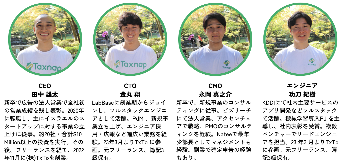 TxTo(テキスト)はミッションとして「Swipe the world どんな課題もスワイプひとつで解決する。そのために私たちは考える」を掲げるスタートアップです。足元では、AIを活用したスワイプ会計アプリ『タックスナップ』で、個人事業主やフリーランスの可処分時間と所得を最大限にするために日々事業に取り組んでおります。
