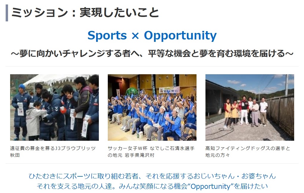 「Sports × Opportunity」を理念に、「若者がチャレンジできる機会を与える」「若者に夢を与えるスポーツ団体を応援する」「スポーツで地方を元気にする」ことを通して平等な機会・夢を育む環境づくりを目指す、スポーツに特化したクラウドファンディングを提供するベンチャー企業。