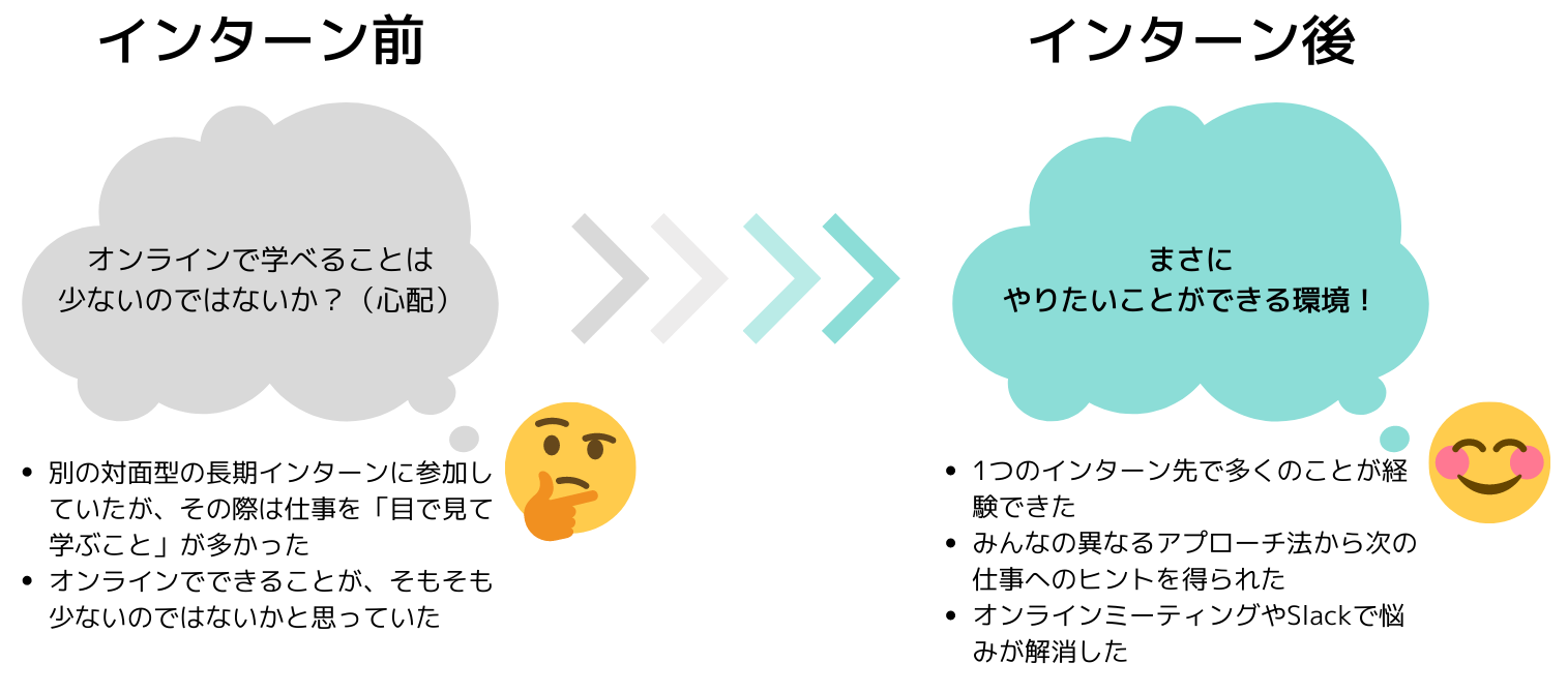 インターン前は「完全オンラインは楽で大学の空きコマでもできてよいな」と思っていました。ただしその反面、「オンラインで学べることは限られているだろうな」と思っていました。