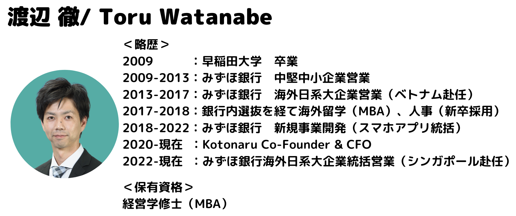 これを書いている2022年10月時点では、数百万人のユーザーを抱えるスマホアプリの事業統括@みずほ銀行と、スタートアップのCFO@Kotonaruをしています。実は、かねてからの希望が叶いまして、2022年11月くらいから再び海外赴任予定です。