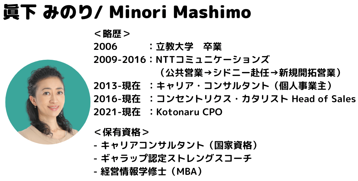 改めまして、こんにちは。株式会社Kotonaru(コトナル)でCPOをしている眞下です。私の詳しい紹介は<経営メンバー紹介 第三弾>自称「おせっかいかーちゃん」!CPO眞下みのりにありますので、よろしければ読んでください。