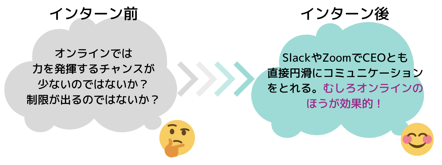 インターン前はチャンスが少ない可能性を懸念していましたが、実際には全然違いました。夏季休暇の旅行先からでも飛行機や新幹線の上からでも、ほぼすべての業務ができ、むしろオンラインのほうが優れてる!と思いました。