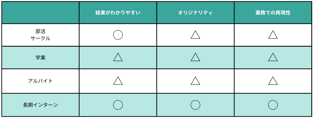 3つのポイントを最も満たした強いガクチカになりやすいのはどんな経験でしょうか?以下のマトリクスを見れば一目瞭然、長期インターンです。『就業白書2022』によれば、インターンを長期で実施している企業は全体の1.3%しかなく、そもそも希少性が高いです。また、就業体験であるからこそ、業務での再現性は最も高いでしょう。インターンの仕事内容にも寄りますが、基本的には何かの目標が設定されるはずなので、その結果はわかりやすいはずです。