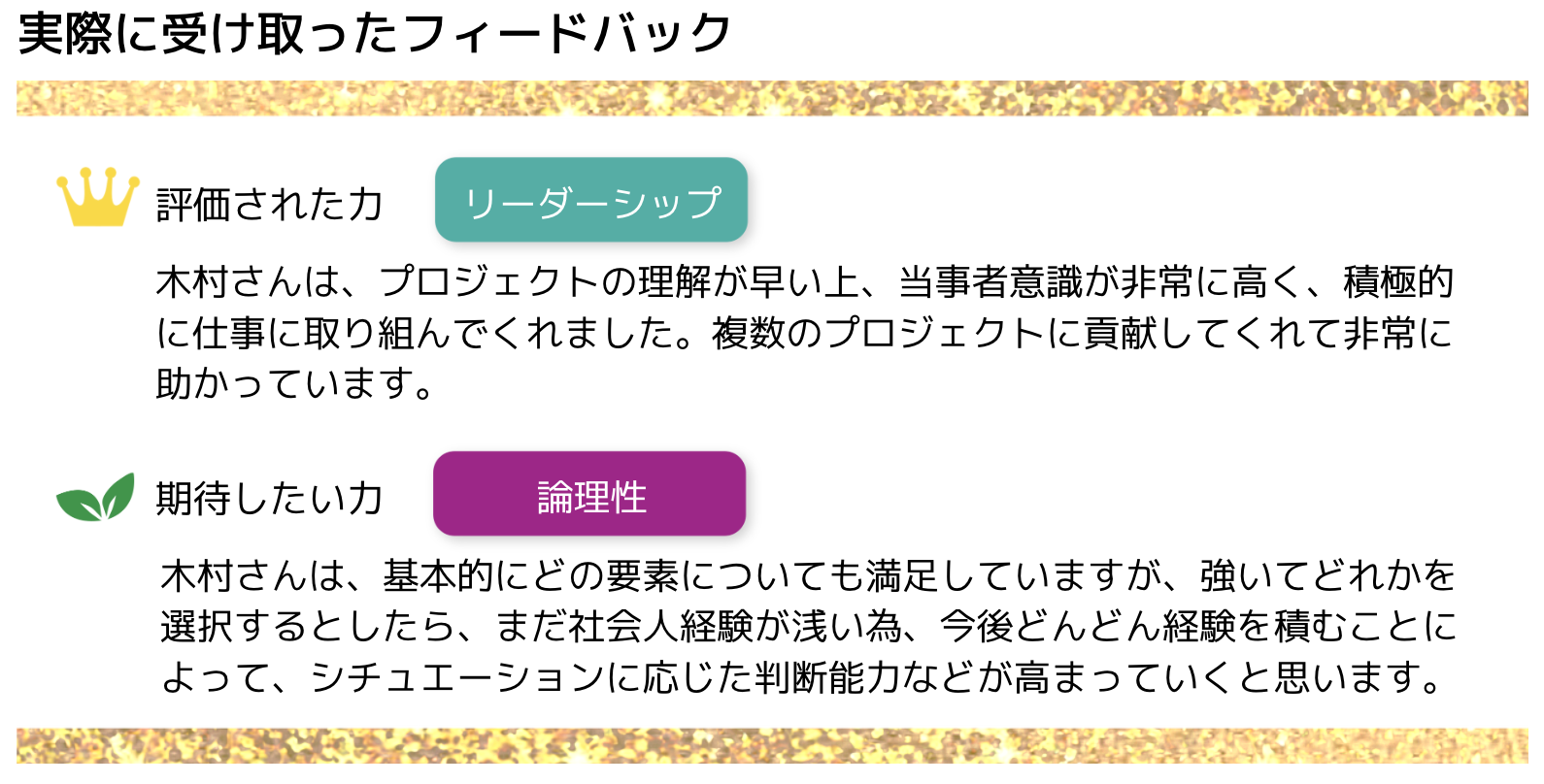 毎月届くフィードバック(Kotonaru Power 8:注1)には、評価点(評価された力)と改善点(期待したい力)が具体的に明記されており、日頃のミーティングではなかなか聞けない点や見落としていた点を発見することができます。前の月の振り返りだけでなく、今月どこを重点的に改善すべきなのか、具体的に計画する機会を与えてくれるため、大変大きな助けになっています。
