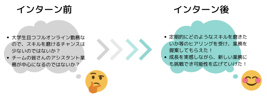 インターンを始める前は、大学生且つフルオンラインでの勤務のみということで、職場で先輩社員からご指導いただきスキルを磨けるチャンスは少ないのではないかと思っていました。その結果、本当は自主性を持って活動したいとい思っているものの、チームの皆さんのアシスタント業務を行うことが多くなるのではのではないかと思っていました。