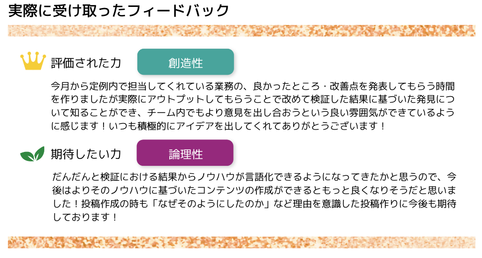 足りない能力ばかり指摘されるのではなく、しっかり良い点も評価していただけるので、モチベーションの低下が起きにくく、意欲向上に繋がっています。個人的には、上司の価値観や求めてる力を知ることが出来るので、「私は何が足りていないだろう・・・」と自問自答する時間が減り、業務効率化やスムーズなコミュニケーションにも繋がっていると思います。