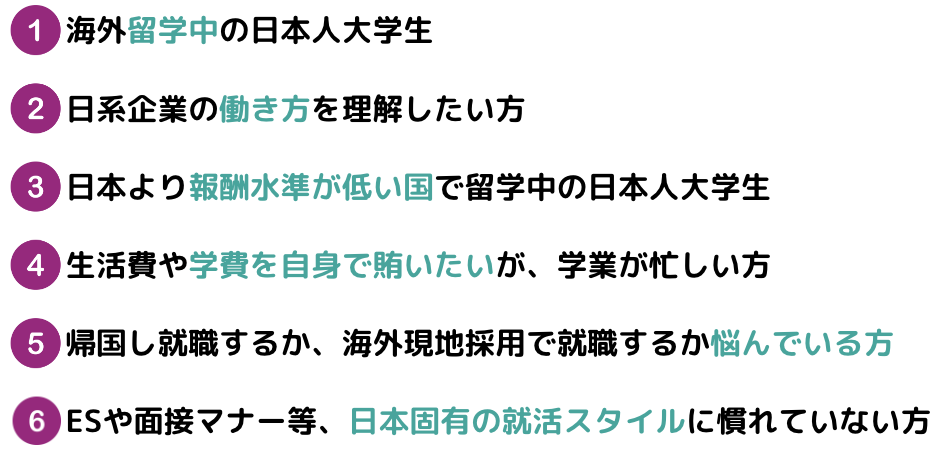 - ︎フルオンライン勤務に理解のある柔軟思考の企業様とマッチングできること:海外居住の為、時差や日本の大学と異なる授業体制や課題量を理解いただけることが大切でした。