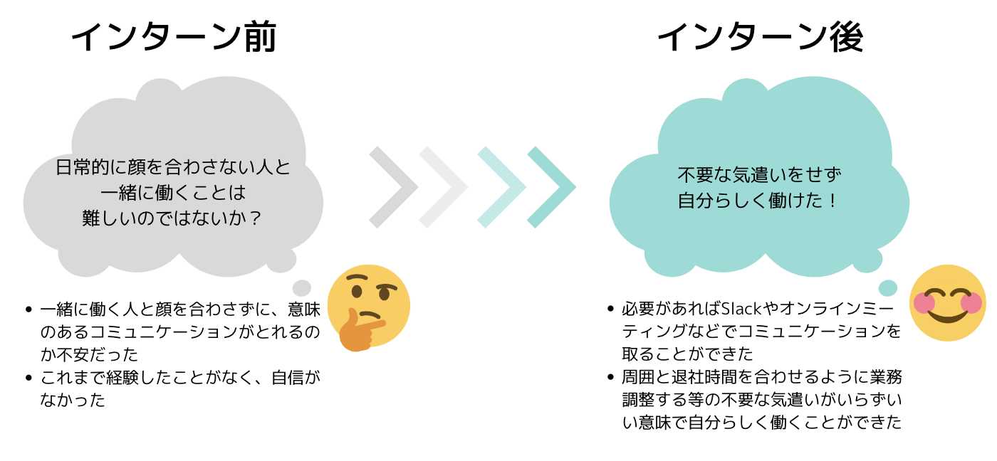 Slackなどのツールを使って連絡を取り合うことが基本となり、文字のコミュニケーションが中心でした。結果として、文章で自らの意図を伝える力がついたと思います。