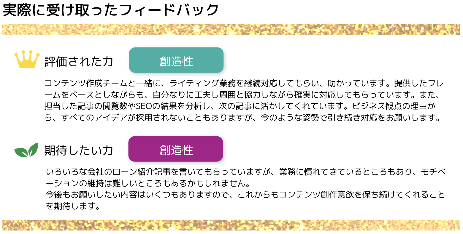 フィードバックを、毎月楽しみにしています。ある時のフィードバックで、自分があまり業務で発揮できていないと考えていた「創造性」が評価されており、驚きました。自分としては、「論理性」であったり、一つの記事を書く「スピード」が評価されていると考えていたので、かなり意外だったのです。